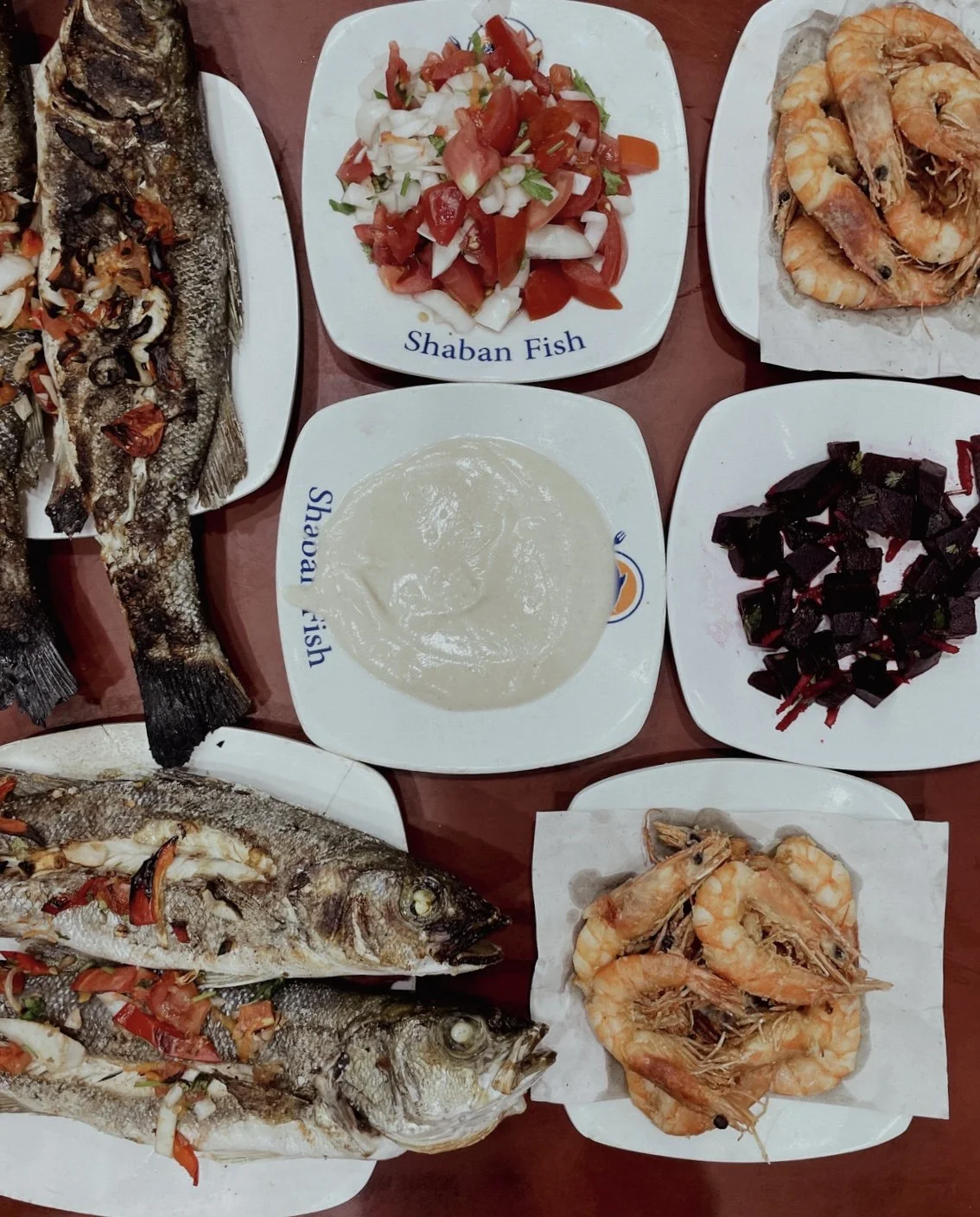 Want that delicious seafood but feel up to a way more local vibe? Give Shaaban a chance! Just a ten-minutes walk from the corniche, down some alleys and around a few corners, have a seat next to your new street cat friend and let the owner suggest your meal. They’ll serve you up some warm seafood broth in a short glass before adorning your table with bread and salads—drink the broth. Question it if you must, and then take a nice sip and let yourself relax in the small joys after probably walking several thousand steps around a few thousand new acquaintances.